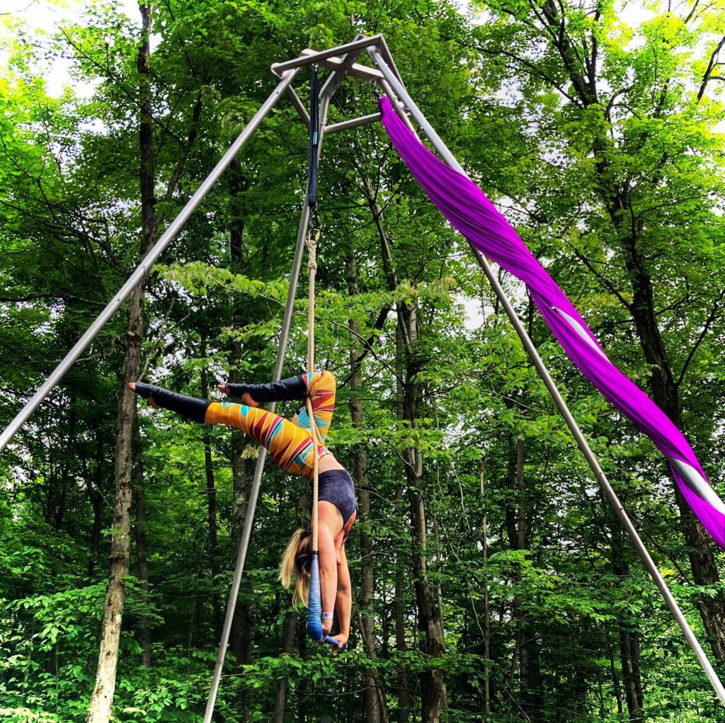 Our circus rig at full size is 23 feet high, and about 20 x 20 feet at the base.  It is adjustable to a variety of lower heights and smaller footprints. Our circus rig can support performances on aerial silks, hoop, trapeze, rope and doubles acts.